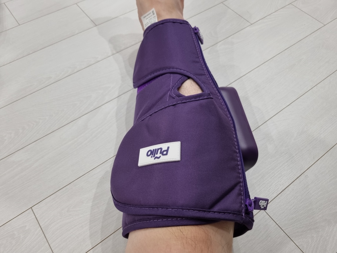 사용법은 아주 간단했습니다. 흔히 '찍찍이'라고 부르는 벨크로를 열어서 종아리를 감싼 후 다시 벨크로를 붙여주면 됩니다. 그러고 나서는 평소 사용 전후에는 옆면의 지퍼를 이용해 착용하고 벗으면 되겠습니다.